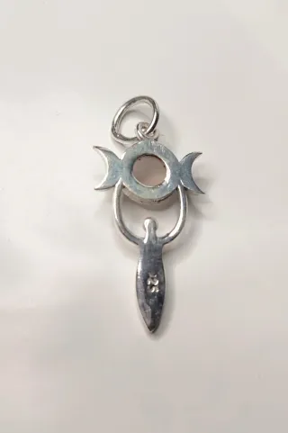 Triple luns y diosa . Colgante con diseño de triple luna y figura femenina, engarzado con un Cuarzo rosa - Plata de ley 925. - Piedra central: cuarzo rosa - Diseño simbólico de triple luna.