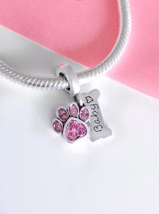 🔸 Charm para pulsera Pandora, de PLATA con su sello S925 🔸 Doble colgante, una huellita de perro en color rosa y un hueso 🔸 Se entrega en cajita