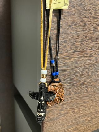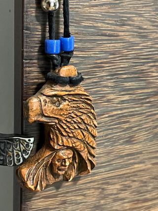 Dos colgantes con diseños inspirados en la cultura nativa americana. Uno representa un tótem y el otro la cabeza de un águila. - Colgante tótem detallado. - Colgante cabeza de águila tallada. - Cuerdas de cuero y cordón. - Cuentas decorativas.