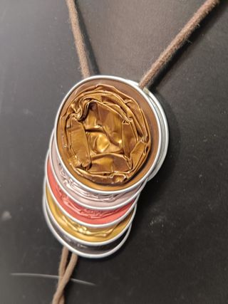 Collar con un diseño único y llamativo, perfecto para añadir un toque de estilo. - Colgante con varias piezas de formas y texturas variadas. - Cierre de cordón ajustable.