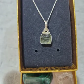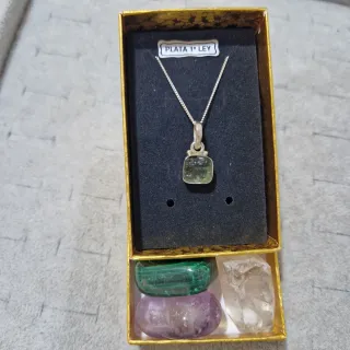 Collar con colgante de moldavita engarzado en plata. - Colgante de moldavita. - Cadena de plata 925. - Incluye caja de presentación.