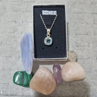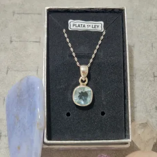Elegante colgante con piedra de topacio azul y cadena de plata de primera ley. - Diseño moderno y delicado. - Cierre de mosquetón. - Incluye caja para regalo.