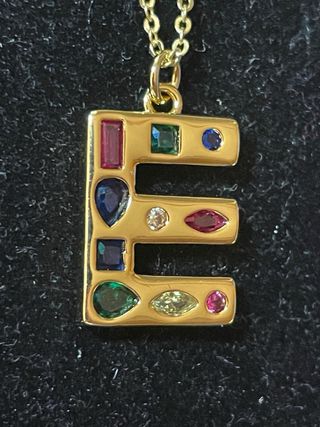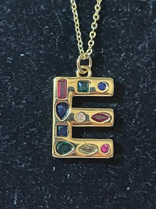 Colgante con la letra E adornado con diversas piedras de colores. - Diseño de la letra E en color dorado. - Incrustaciones de piedras de colores. - Cadena dorada incluida.