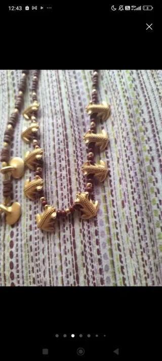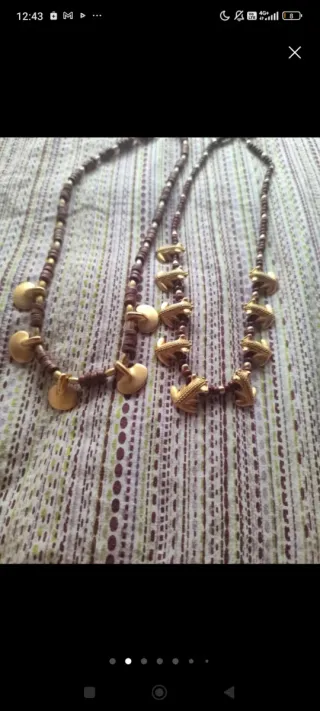Collar de estilo precolombino con detalles en oro de 24 quilates. - Elaborado con cuentas marrones y doradas. - Diseño con colgantes circulares y figuras. - Pieza única con un acabado artesanal. *Difíciles de encontrar *Consultar precios internet