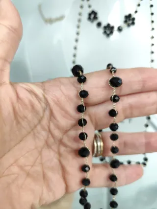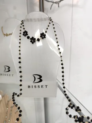 Elegante collar de la marca Bisset con cristales negros y detalles dorados. Un accesorio que aporta un toque de sofisticación. - Diseño con motivos florales. - Cadena fina y delicada. - Artesanal