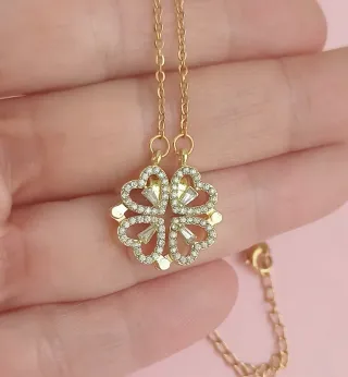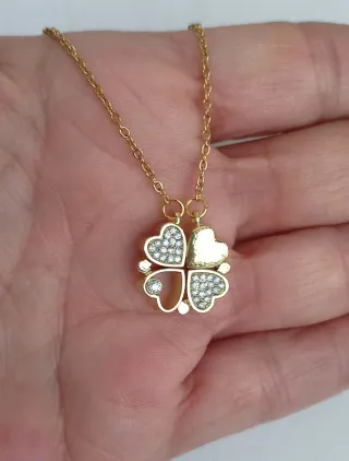 Nuevo. Elegante collar con colgante de trébol de cuatro hojas en forma de corazón. - Diseño 2 en 1: - Cerrado con forma de trébol corazones. - Abierto con fila de corazones. - Acero inoxidable 316L con Baño de oro. - Detalle de circonitas incrustadas. - Cadena fina ajustable. - Magnético. - Presentado en cajita de regalo. NO hago envíos, recoger por mi zona.