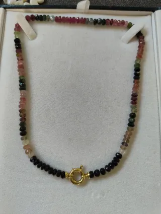 Elegante collar hecho a mano con cuentas de turmalina en varios tonos y un cierre mosquetón de oro de ley de 18 kilates - Cuentas de turmalina facetadas. - Cierre de mosquetón en oro. - Diseño único y colorido.