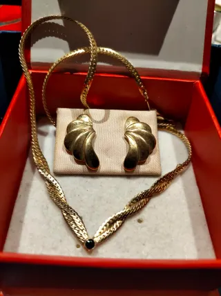 Conjunto vintage de collar y pendientes chapado en oro - Diseño elegante y atemporal. - Acabado en tono dorado. - Detalle de piedra negra en el collar.