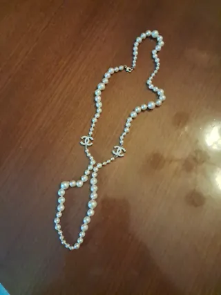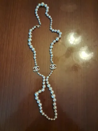 Elegante collar de perlas con detalles de la marca. - Perlas de color blanco. - Dos icónicos logos de Chanel adornan la pieza. - Cierre metálico.