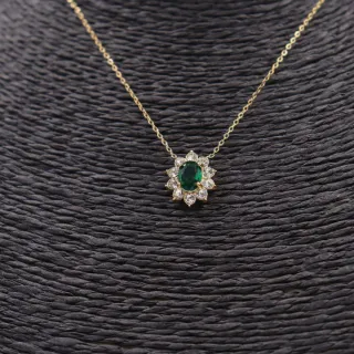 Elegante collar con baño de oro y un diseño floral. - Colgante central con una piedra ovalada. - Rodeado por pequeñas circonitas blancas. - Cadena fina y delicada.