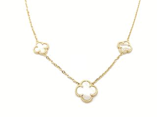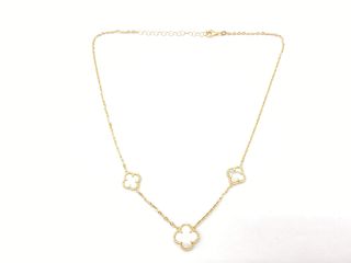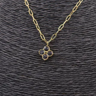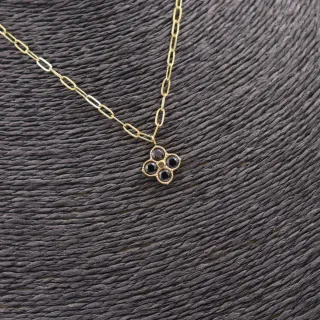 Elegante collar con baño de oro y un diseño de trébol adornado con piedras negras. - Baño de oro. - Diseño de trébol. - Piedras negras.