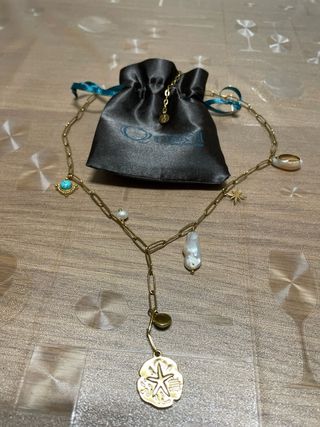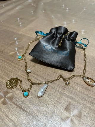Collar de la marca OUI, perfecto para el verano. - Diseño con cadena dorada. - Colgantes de turquesa y perla. - Detalle de concha. - Charm de brújula.