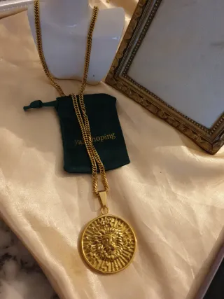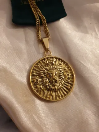 Elegante collar con un colgante de diseño. - Chapado en oro. - Diseño de león con rayos solares.