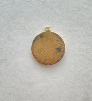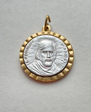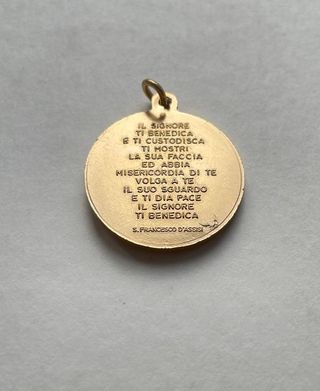 Medalla dorada y pateada. En la parte trasera tiene la siguiente oración: UL SIGNORE TI BENEDICA E TI CUSTODISCA TI MOSTRI LA SUA FACCIA ED ABBIA MISERICORDIA DI TE VOLGA A TE IL SUO SGUARDO E TI DIA PACE IL SIGNORE TI BENEDICA medalla colgante cadena collar cruz oro plata dorado plateado arte religioso santo virgen cristo