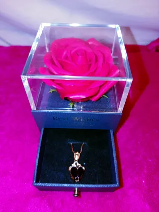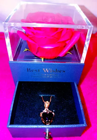 Precioso conjunto de rosa eterna y collar con colgante de corazón oro rosa. - Rosa preservada. - Collar con cadena oro rosa. - Colgante con forma de corazón y detalles. - Caja de regalo incluida.