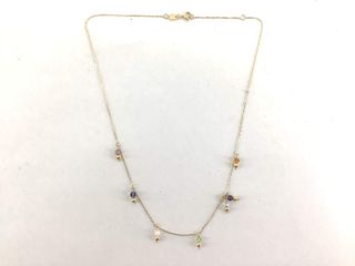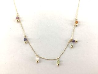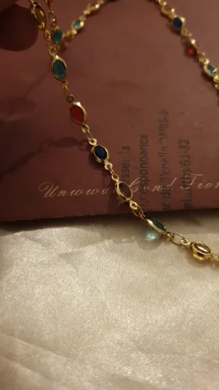 Elegante collar chapado en oro con un diseño delicado y piedras de colores. - Cadena dorada. - Piedras de corte ovalado en tonos variados. - Cierre de mosquetón.