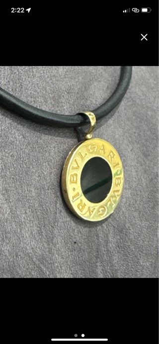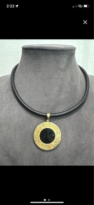 Elegante collar Bvlgari con detalles en oro de 18 quilates y un distintivo centro negro con ónix . - Diseño circular con inscripciones de la marca - Cordón negro. - Acabado dorado.
