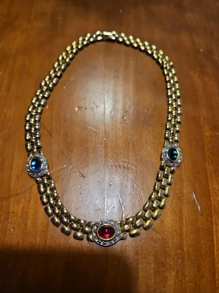 Elegante collar con un diseño llamativo y detalles de piedras semipreciosas. Mide 40 cm - Cadena dorada con eslabones. - Tres piedras centrales: una azul, una roja y una verde. - Bordes de las piedras adornados con pequeños cristales.