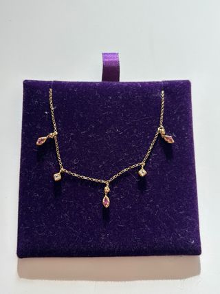 Elegante collar de la marca Aristocrazy plata bañado en oro, con detalles en topacios rosas y transparentes. - Diseño delicado con colgantes. - Piedras de topacio en tonos rosados y transparentes. - Cadena fina y ajustable. Está prácticamente sin usar.