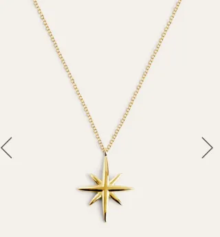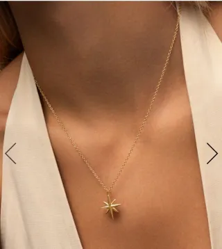 Elegante collar con un colgante en forma de estrella de ocho puntas. La cadena es fina y delicada. - Material: Plata de Ley 925. - Acabado: Baño de Oro de 18 kt. - Cadena de 45 cm + 5 cm de extensión. - Estrella de 23 mm de largo x 11,3 mm de ancho. - Cierre de mosquetón con cadena de ajuste. Se entrega en su caja original. Tal y como se muestra en la última foto.