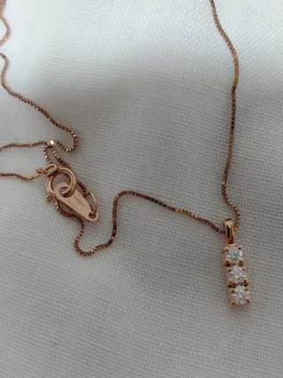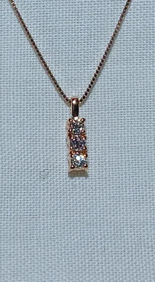 Colgante oro rosa 18k con 3 diamantes de 0.04ct cada uno y un tcw de 0.12. Son diamantes naturales de corte redondo brillante, claridad VS1/VS2 y color G. Peso total 1.3g. Incluye cadena veneciana en oro rosa 18k ajustable de 40-45cm. Incluye garantía gemológica.