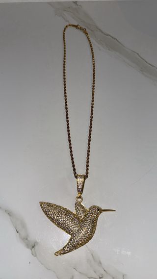 Elegante collar con colgante de pájaro adornado con brillantes. - Diseño detallado de colibrí. - Cadena dorada estilo soga. - Colgante cubierto de pequeñas piedras brillantes.