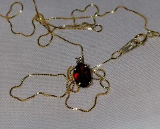 Elegante colgante de oro amarillo 18k con un granate rojo intenso de 0.30 ct y un diamante de 0.01ct de corte redondo excelente de color G y claridad vs1/vs2. Peso 1.5 gramos(el peso que pone en la tarjeta está mál). Incluye cadena veneciana de oro amarillo de 18k de 40-45 cm ajustable. Incluye tarjeta de autenticidad. Hecho en Italia.
