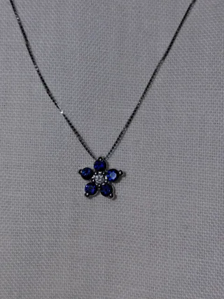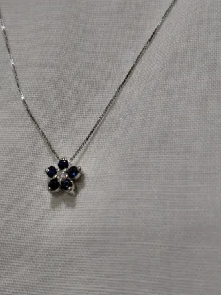 Colgante de cinco zafiros de 0.10tcw y un diamante de 0.03ct de corte redondo, brillante, excelente. Color G/H. Claridad vs1-vs2. Peso total 1.5 gramos(el peso que pone en la tarjeta está mál). En oro blanco 18k. Incluye cadena veneciana regulable de 40-45 cm. Nuevo sin estrenar. Incluye garantia gemológica.