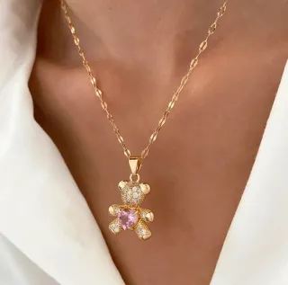 Collar con un dulce diseño de oso y corazón rosa 🩷 Diseño: - Colgante con forma de oso. - Detalle de corazón rosa en el centro. - Incrustaciones de pequeñas piedras brillantes ✨️ Detalles: Material: Acero inoxidable bañado en oro 18k ⚜️ Color: Dorado 🥇