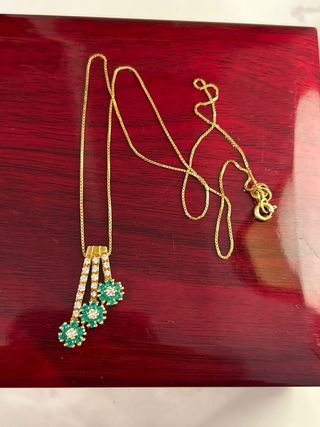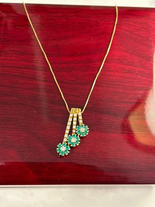 Elegante collar de oro amarillo de 18kt con esmeraldas y diamantes. Una pieza exquisita. Mide 40,5cm y pesa 5,24g