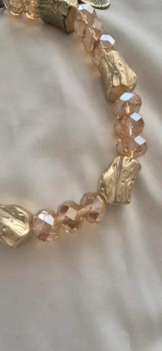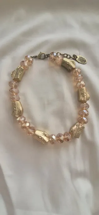 Elegante collar de la marca TERIA YABAR con un diseño único. - Combina cuentas facetadas en tono rosa pálido con piezas metálicas doradas de formas orgánicas. - Cierre de mosquetón y cadena de ajuste para un ajuste a tu gusto - Detalle de placa ovalada con el logo de la marca.