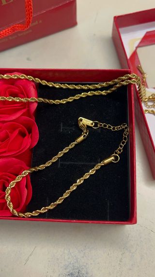 Una pieza sencilla pero muy elegante, ideal tanto para sorprender a alguien especial como para completar tu look diario. ✨ Se trata de un conjunto de collar y cadena laminados en oro de 18k, con un brillo intenso y un acabado fino que luce muchísimo puesto. Está totalmente nuevo, sin uso. La cadena mide 45 cm de largo y 3 milimetros de ancho, y la pulsera 21 cm de largo y 3 milimetros de ancho. queda ajustada al cuello y favorece mucho, mientras que el collar completa el conjunto con un toque delicado y sofisticado, perfecto para llevar juntos o combinar con otros accesorios. No hago cambios, solo venta.