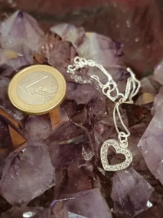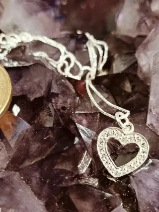 Elegante collar con un colgante en forma de corazón, adornado con pequeñas piedras brillantes. La cadena es fina y delicada. Todo realizado en plata de ley y nueva, en elegante bolsa de tela para regalo. - Colgante de corazón con incrustaciones. - Cadena de plata. Regalo joya oro plata joyería adorno colgante amor navidad