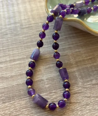 Elegante collar con cuentas de amatista natural y detalles dorados. - Piedras de amatista de diferentes formas y tamaños. - Cuentas pequeñas doradas intercaladas. - Cadena extensible para ajustar la longitud.