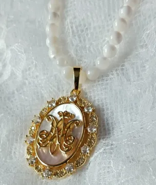 Collar y medalla con el símbolo Avemaría en nácar natural chapado en oro de 18 kilates con collar de nácar Disponible también en plata Precioso y muy elegante Para fallera A estrenar