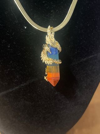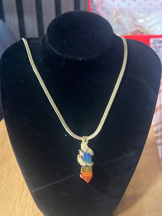 Elegante collar de 60 cm con cadena laminada en oro de 14 quilates. El colgante presenta un diseño de dragón que envuelve una piedra con los colores del arcoíris, representando las energías de los chakras. - Cadena de 60 cm. - Baño de oro de 14k. - Colgante con dragón y piedra de chakras.