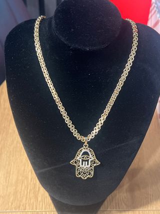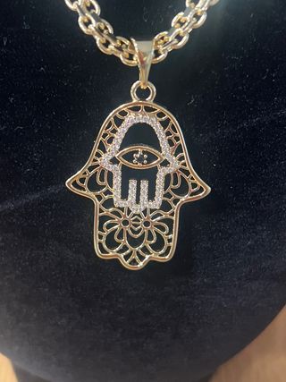 Elegante collar laminado en oro de 14 quilates con un colgante de Hamsa. - Largo del collar: 45 cm. - Colgante con diseño de Hamsa y ojo. - Detalles en circonitas.