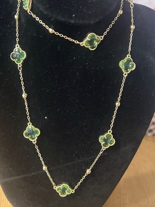 Elegante collar laminado en oro de 14 quilates con un diseño de tréboles. - Longitud del collar: 45 cm. - Detalle de pequeñas cuentas doradas entre los tréboles. - Colgantes en forma de trébol con incrustaciones verdes.