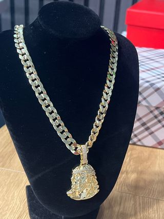 Elegante collar con colgante de Cristo laminado en oro de 14 quilates. Una pieza llamativa y con estilo. - Longitud del collar: 60 cm. - Diseño detallado del rostro de Cristo. - Cadena tipo cubana gruesa.