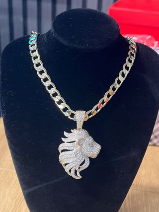 Elegante collar con colgante de león laminado en oro de 14 quilates. La cadena tiene una longitud de 50 cm. - Diseño detallado del león con incrustaciones. - Cadena tipo cubana. - Acabado brillante.