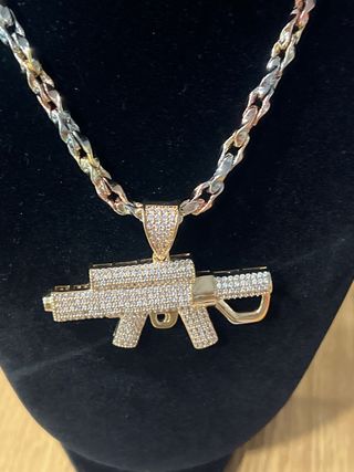 Collar laminado en oro de 14 quilates con un diseño llamativo. - Longitud de 45 cm. - Colgante con detalles en negro y verde.