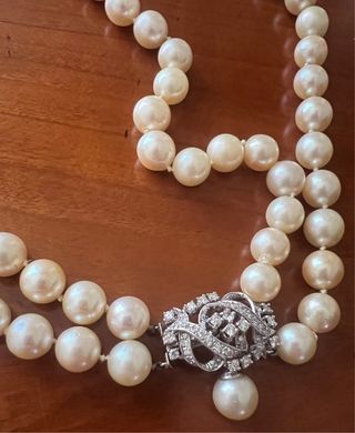 Elegante collar de perlas australianas de la marca Suárez. Un clásico atemporal con un diseño sofisticado. - Cierre con detalles de circonitas. - Perlas de gran tamaño y brillo. - Broche de oro blanco y diamantes. - Doble hilo de perlas