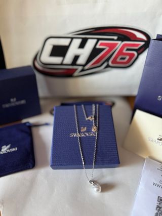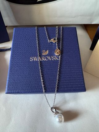 Elegante collar de la marca Swarovski con un colgante de perla blanca y detalles plateados. Un accesorio delicado y sofisticado. - Diseño con perla central. - Cadena fina plateada. Más productos en mi perfil 👌🔝