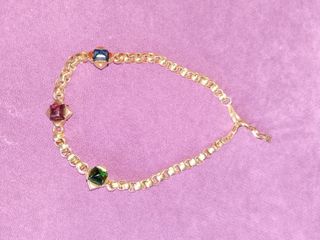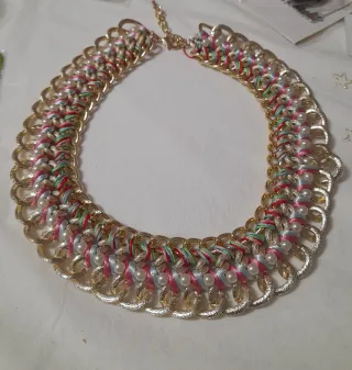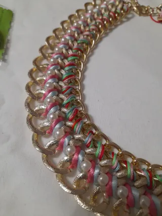 Elegante collar hecho a mano con un diseño único. - Cadena dorada. - Detalles de perlas. - Hilos de colores entrelazados.