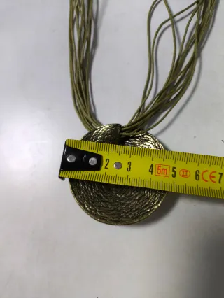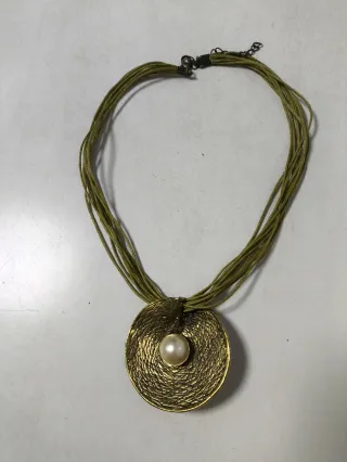Elegante collar con un colgante circular de bronce y una perla central. Los cordones son de un llamativo color verde. - Colgante de bronce con textura. - Perla blanca como detalle central. - Múltiples cordones verdes.