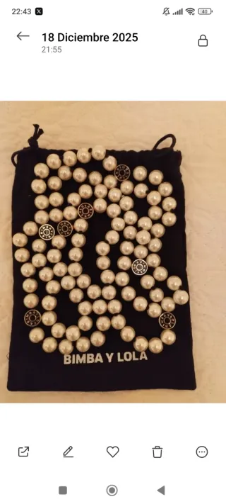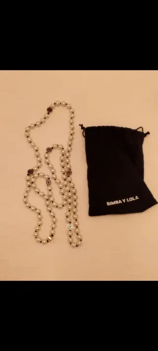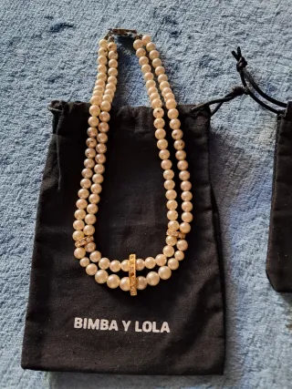 Elegante collar de perlas de la marca Bimba y Lola. - Diseño con perlas blancas y detalles dorados. - Incluye bolsa de tela para guardarlo.