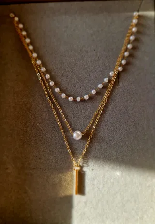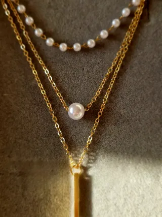 Elegante collar de varias cadenas con un diseño delicado. - Cadena superior con pequeñas perlas. - Cadena intermedia con una perla central. - Cadena inferior con un colgante de barra dorada.