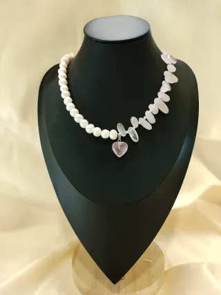 Elegante collar con perlas de río y cuarzo rosa, adornado con un colgante en forma de corazón. - Perlas de río de tono blanco. - Piedras de cuarzo rosa de forma irregular. - Colgante central en forma de corazón de cuarzo rosa. - Detalle de pequeñas cuentas de plata entre las piedras de cuarzo.