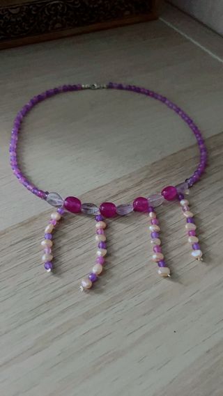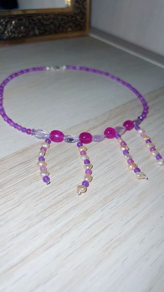 Elegante collar hecho a mano con una combinación de perlas y piedras naturales: ágatas (que calma emociones, aumenta la autoconfianza, mejora la concentración y fomenta el amor y elcoraje);amatista( emite vibraciones espirituales elevadas. Actúa como un bálsamo natural, bloqueando tensiones y energías negativas que puedan rondar tu entorno. Su serenidad no solo calma la mente, sino que también potencia estados elevados de conciencia y meditación). El cierre es plata de ley. - Cuentas de color morado y detalles en fucsia. - Colgantes con perlas y cuentas moradas. - Cierre metálico.