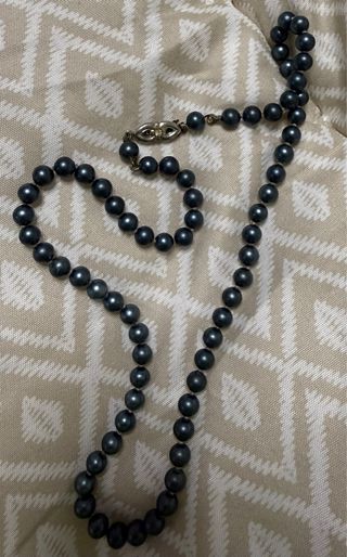 Elegante collar de perlas de estilo antiguo. Un accesorio clásico que añade un toque de sofisticación. - Cierre metálico. - Perlas de color negro y gris.